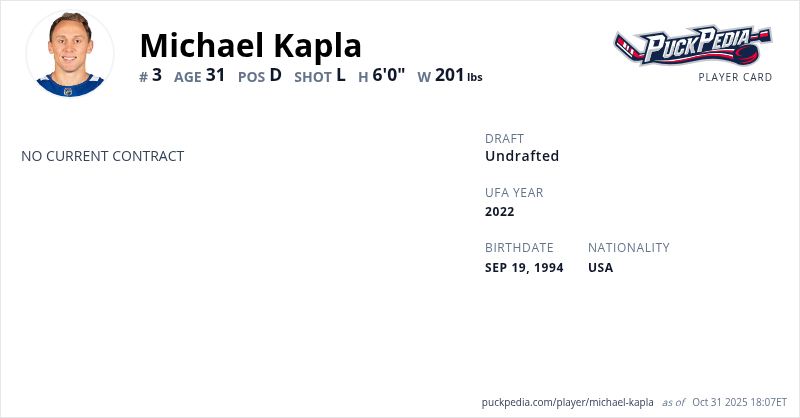 Michael Kapla is an Unrestricted Free Agent (No Qualifying Offer). His last contract was 1 year, $874,125 with a cap hit of $874,125 per season. It expired at the end of the 2018-19 season.