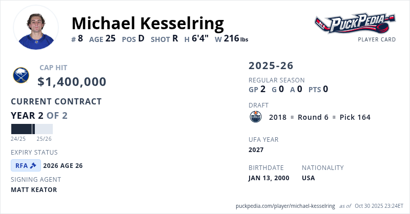 Michael Kesselring is signed to a 2 year, $2,800,000 contract with a cap hit of $1,400,000 per season, playing for the Buffalo Sabres. His contract expires at the end of the 2025-26 season, making Kesselring a Restricted Free Agent.