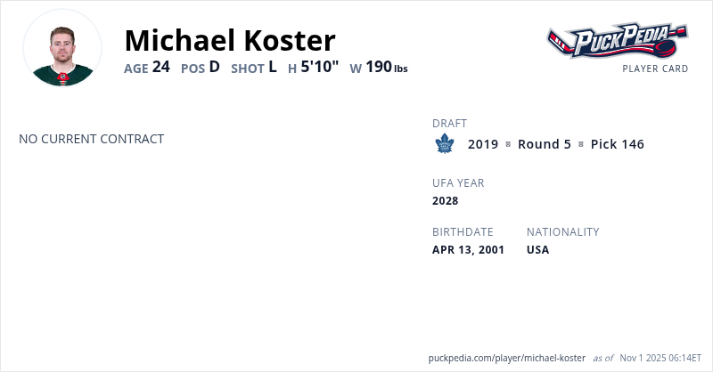 | 2024-25 | 23 | ECHL | Iowa Heartlanders | 7 | 0 | 5 | 5 | 0 | Playoffs | 7 | 2 | 4 | 6 | 0 | ||||||||||||||||