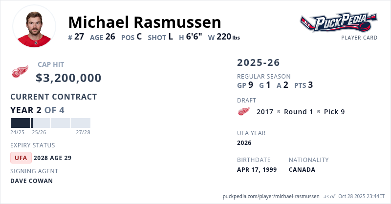 Michael Rasmussen is signed to a 4 year, $12,800,000 contract with a cap hit of $3,200,000 per season, playing for the Detroit Red Wings. His contract expires at the end of the 2027-28 season, making Rasmussen an Unrestricted Free Agent.