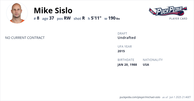 Mike Sislo is an Unrestricted Free Agent. His last contract was 1 year, $650,000 with a cap hit of $650,000 per season. It expired at the end of the 2018-19 season.