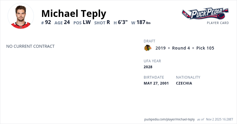 The Blackhawks promoted Teply from their taxi squad to their active roster Friday.