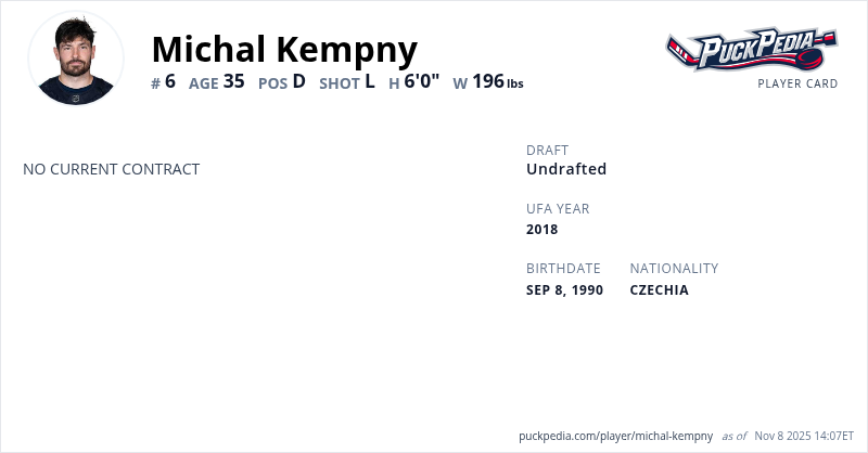 Michal Kempny is an Unrestricted Free Agent. His last contract was 1 year, $750,000 with a cap hit of $750,000 per season. It expired at the end of the 2022-23 season.