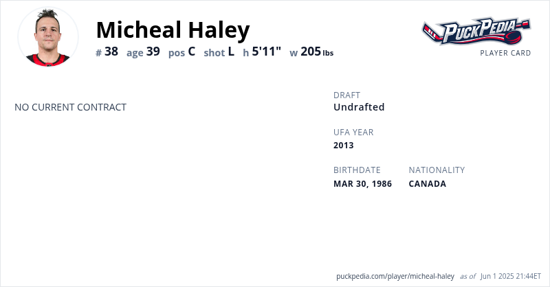 Micheal Haley is an Unrestricted Free Agent. His last contract was 1 year, $700,000 with a cap hit of $700,000 per season. It expired at the end of the 2020-21 season.