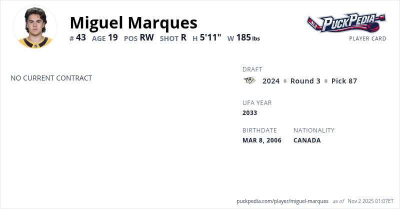 Marques was the 87th overall pick by the Nashville Predators in the 2024 NHL Entry Draft on Saturday.