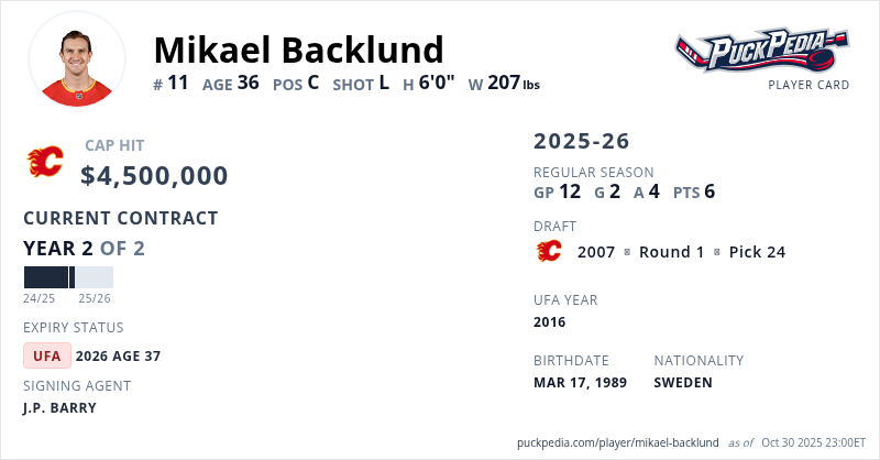 Mikael Backlund is signed to a 2 year, $6,500,000 contract extension with a cap hit of $3,250,000 per season. He plays for the Calgary Flames. His next contract begins for the 2026-27 season and expires at the end of the 2027-28 season, making him an Unrestricted Free Agent.