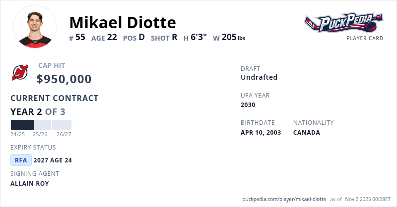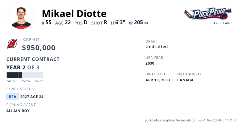 Mikael Diotte is signed to a 3 year, $2,850,000 contract with a cap hit of $950,000 per season, playing for the New Jersey Devils. His contract expires at the end of the 2026-27 season, making Diotte a Restricted Free Agent.