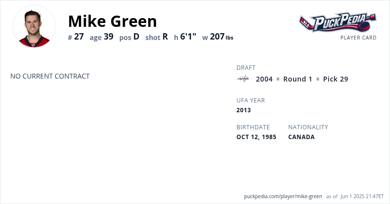 Mike Green is an Unrestricted Free Agent. His last contract was 2 years, $10,750,000 with a cap hit of $5,375,000 per season. It expired at the end of the 2019-20 season.