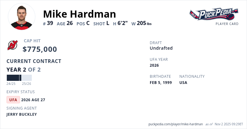 Mike Hardman is signed to a 2 year, $1,550,000 contract with a cap hit of $775,000 per season, playing for the New Jersey Devils. His contract expires at the end of the 2025-26 season, making Hardman an Unrestricted Free Agent.