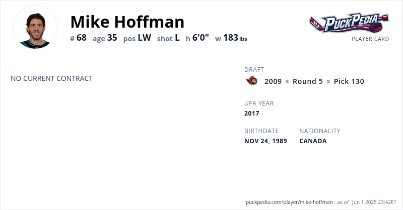Mike Hoffman is an Unrestricted Free Agent. His last contract was 3 years, $13,500,000 with a cap hit of $4,500,000 per season. It expired at the end of the 2023-24 season.