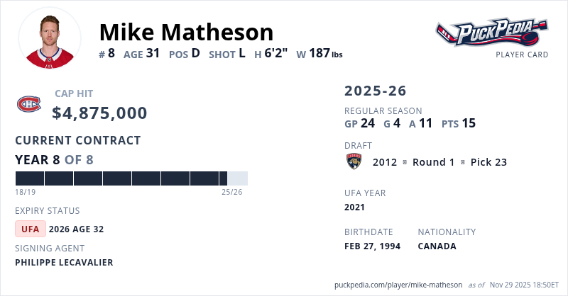 Mike Matheson is signed to a 5 year, $30,000,000 contract extension with a cap hit of $6,000,000 per season. He plays for the Montreal Canadiens. His next contract begins for the 2026-27 season and expires at the end of the 2030-31 season, making him an Unrestricted Free Agent.