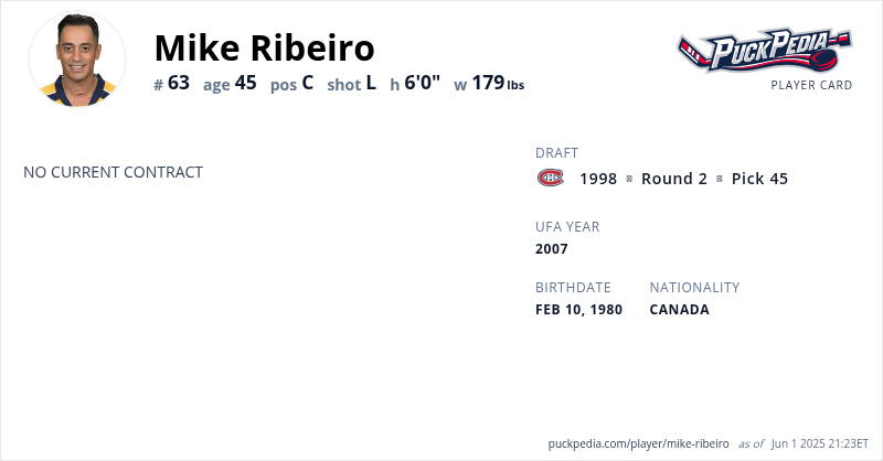 Mike Ribeiro is an Unrestricted Free Agent. His last contract was 2 years, $7,000,000 with a cap hit of $3,500,000 per season. It expired at the end of the 2016-17 season.