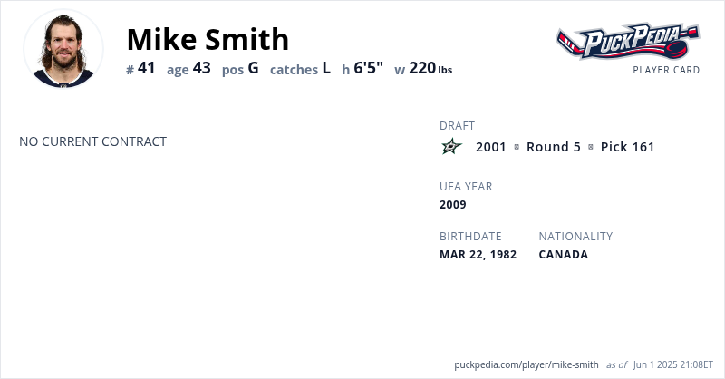 Mike Smith is an Unrestricted Free Agent. His last contract was 2 years, $4,400,000 with a cap hit of $2,200,000 per season. It expired at the end of the 2022-23 season.