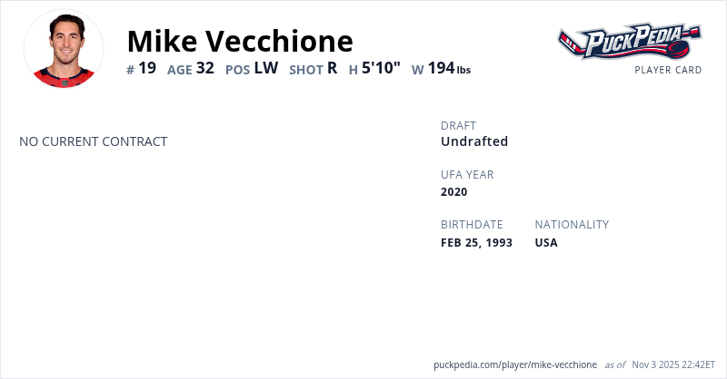 Mike Vecchione is an Unrestricted Free Agent. His last contract was 1 year, $750,000 with a cap hit of $750,000 per season. It expired at the end of the 2022-23 season.