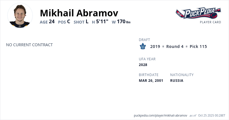 Mikhail Abramov is a Restricted Free Agent. His last contract was 3 years, $2,428,332 with a cap hit of $809,444 per season. It expired at the end of the 2023-24 season.