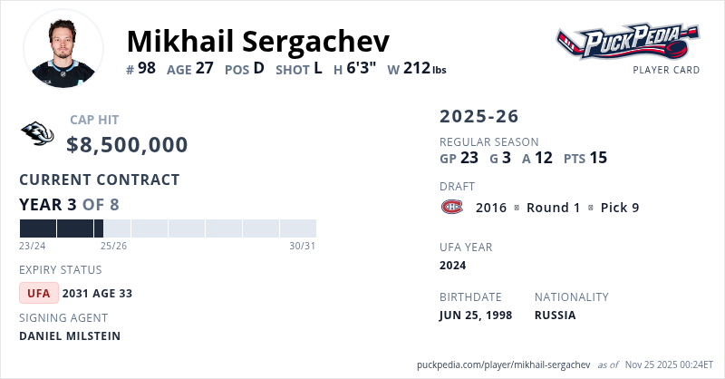 Mikhail Sergachev is signed to a 8 year, $68,000,000 contract with a cap hit of $8,500,000 per season, playing for the Utah Mammoth. His contract expires at the end of the 2030-31 season, making Sergachev an Unrestricted Free Agent.