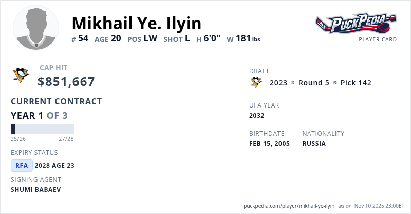 Mikhail Ye. Ilyin is signed to a 3 year, $2,555,001 contract with a cap hit of $851,667 per season, playing for the Pittsburgh Penguins. His contract expires at the end of the 2027-28 season, making Ilyin a Restricted Free Agent.