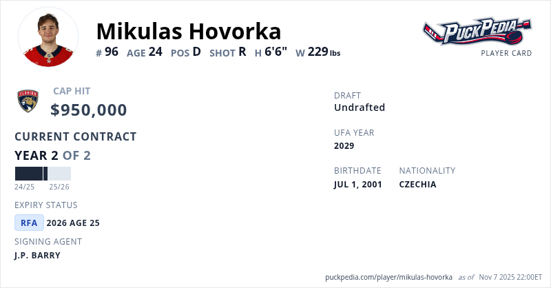 Mikulas Hovorka is signed to a 2 year, $1,900,000 contract with a cap hit of $950,000 per season, playing for the Florida Panthers. His contract expires at the end of the 2025-26 season, making Hovorka a Restricted Free Agent.