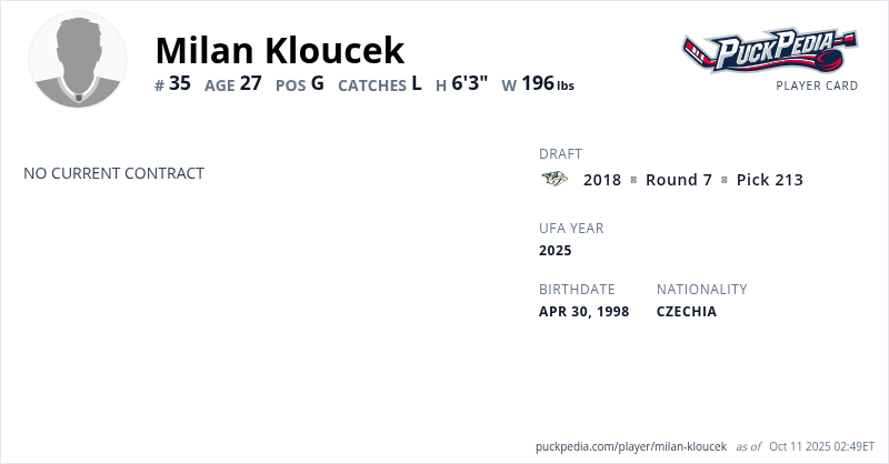| 2023-24 | 25 | Czechia | HC Plzen | 5 | 2.63 | 0.909 | 0 | Playoffs | 1 | 1.58 | 0.941 | 0 | ||||||||||||||||||