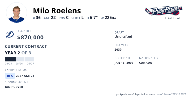 Milo Roelens is signed to a 3 year, $2,610,000 contract with a cap hit of $870,000 per season, playing for the Tampa Bay Lightning. His contract expires at the end of the 2026-27 season, making Roelens a Restricted Free Agent.
