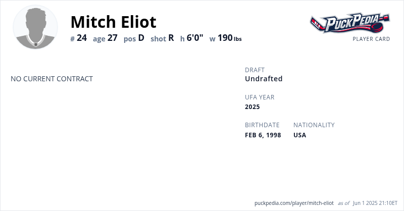 Mitch Eliot is an Unrestricted Free Agent (No Qualifying Offer). His last contract was 3 years, $2,467,500 with a cap hit of $822,500 per season. It expired at the end of the 2020-21 season.