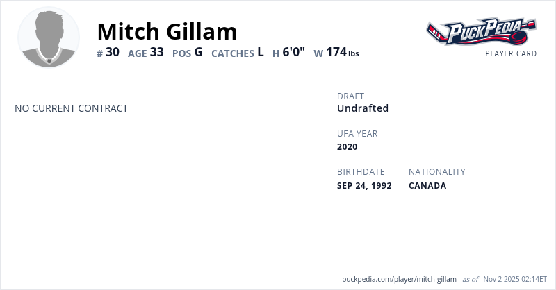 | 2020-21 | 28 | ECHL | Wichita Thunder | 6 | 2.47 | 0.927 | 0 | |||||||||||||||||||||||