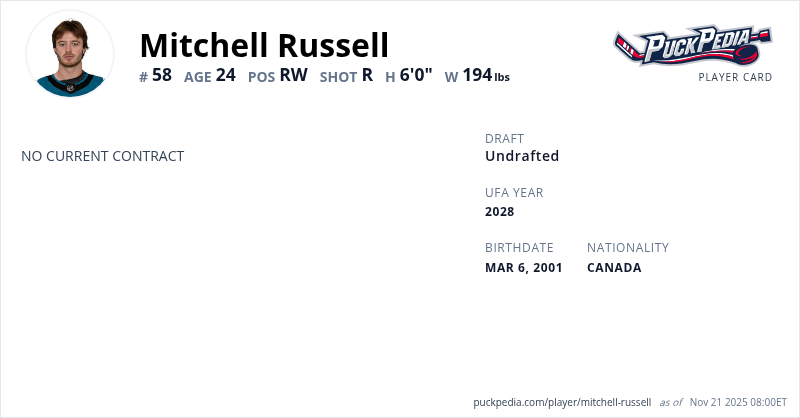 Mitchell Russell is an Unrestricted Free Agent (No Qualifying Offer). His last contract was 3 years, $2,510,001 with a cap hit of $836,667 per season. It expired at the end of the 2024-25 season.