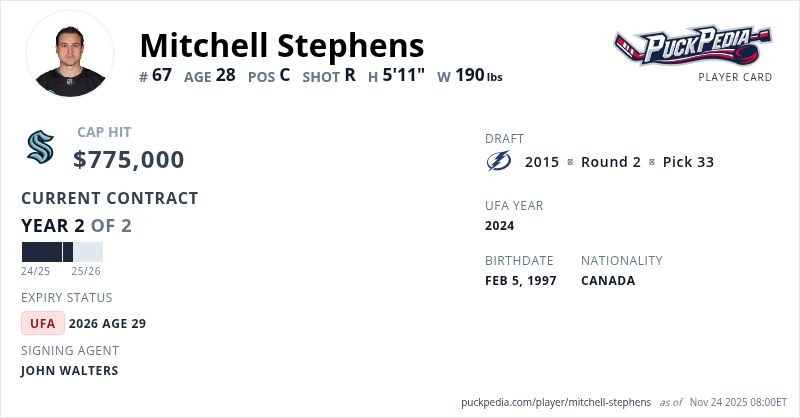 Mitchell Stephens is signed to a 2 year, $1,550,000 contract with a cap hit of $775,000 per season, playing for the Seattle Kraken. His contract expires at the end of the 2025-26 season, making Stephens an Unrestricted Free Agent.