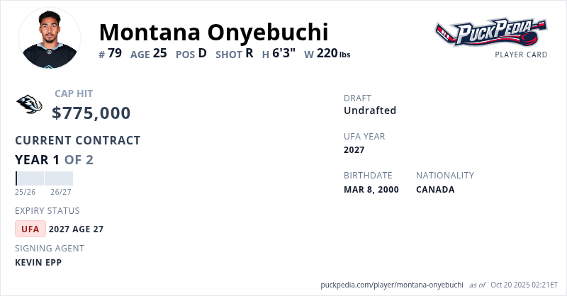 Montana Onyebuchi is signed to a 2 year, $1,550,000 contract with a cap hit of $775,000 per season, playing for the Utah Mammoth. His contract expires at the end of the 2026-27 season, making Onyebuchi an Unrestricted Free Agent.