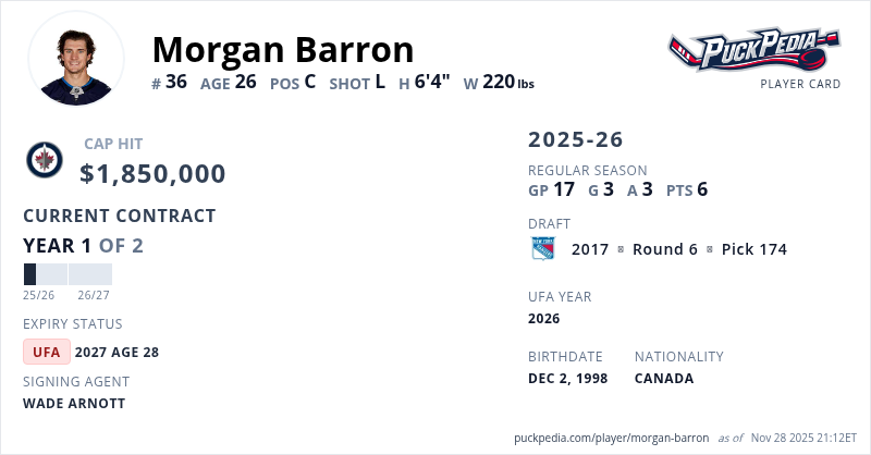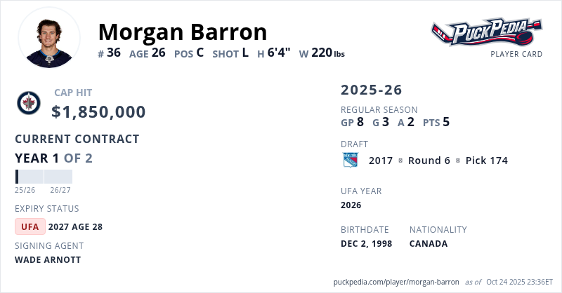 Morgan Barron is signed to a 2 year, $3,700,000 contract with a cap hit of $1,850,000 per season, playing for the Winnipeg Jets. His contract expires at the end of the 2026-27 season, making Barron an Unrestricted Free Agent.