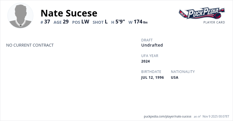 Nate Sucese is an Unrestricted Free Agent (No Qualifying Offer). His last contract was 1 year, $820,000 with a cap hit of $820,000 per season. It expired at the end of the 2020-21 season.