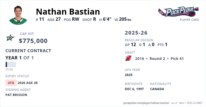 Nathan Bastian is signed to a 1 year, $775,000 contract with a cap hit of $775,000 per season, playing for the Dallas Stars. His contract expires at the end of the 2025-26 season, making Bastian an Unrestricted Free Agent.