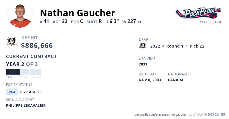 Nathan Gaucher is signed to a 3 year, $2,659,998 contract with a cap hit of $886,666 per season, playing for the Anaheim Ducks. His contract expires at the end of the 2026-27 season, making Gaucher a Restricted Free Agent.