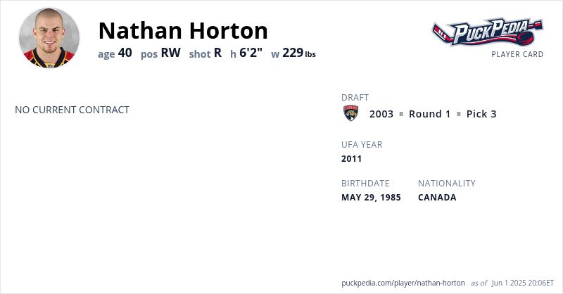 Nathan Horton is an Unrestricted Free Agent. His last contract was 7 years, $37,100,000 with a cap hit of $5,300,000 per season. It expired at the end of the 2019-20 season.