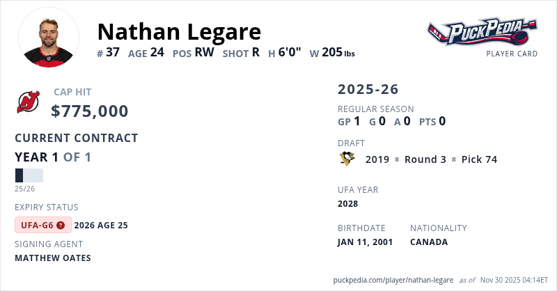 Nathan Legare is signed to a 1 year, $775,000 contract with a cap hit of $775,000 per season, playing for the New Jersey Devils. His contract expires at the end of the 2025-26 season, making Legare an Unrestricted Free Agent (Group 6).