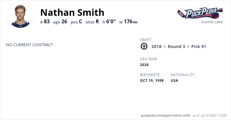Nathan Smith is an Unrestricted Free Agent (Group 6). His last contract was 1 year, $775,000 with a cap hit of $775,000 per season. It expired at the end of the 2024-25 season.