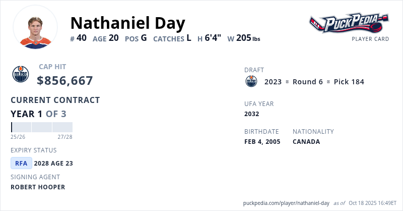 Nathaniel Day is signed to a 3 year, $2,570,001 contract with a cap hit of $856,667 per season, playing for the Edmonton Oilers. His contract expires at the end of the 2027-28 season, making Day a Restricted Free Agent.
