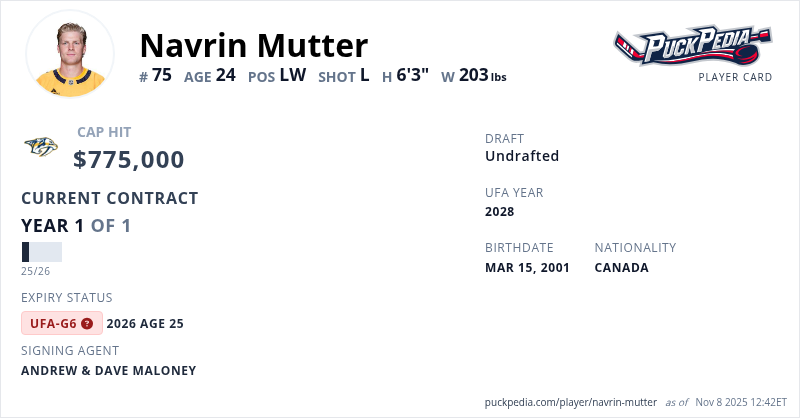 Navrin Mutter is signed to a 1 year, $775,000 contract with a cap hit of $775,000 per season, playing for the Nashville Predators. His contract expires at the end of the 2025-26 season, making Mutter an Unrestricted Free Agent (Group 6).