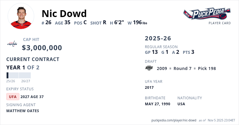 Nic Dowd is signed to a 2 year, $6,000,000 contract with a cap hit of $3,000,000 per season, playing for the Washington Capitals. His contract expires at the end of the 2026-27 season, making Dowd an Unrestricted Free Agent.