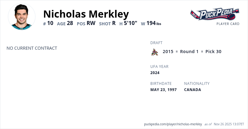 Nicholas Merkley is an Unrestricted Free Agent. His last contract was 1 year, $750,000 with a cap hit of $750,000 per season. It expired at the end of the 2021-22 season.