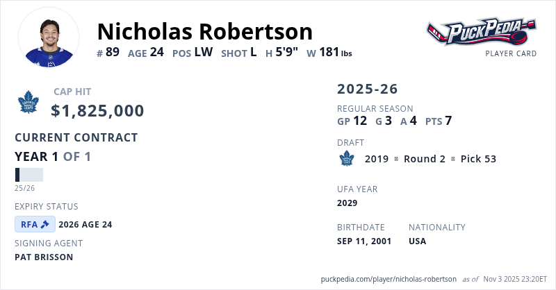 Nicholas Robertson is signed to a 1 year, $1,825,000 contract with a cap hit of $1,825,000 per season, playing for the Toronto Maple Leafs. His contract expires at the end of the 2025-26 season, making Robertson a Restricted Free Agent.