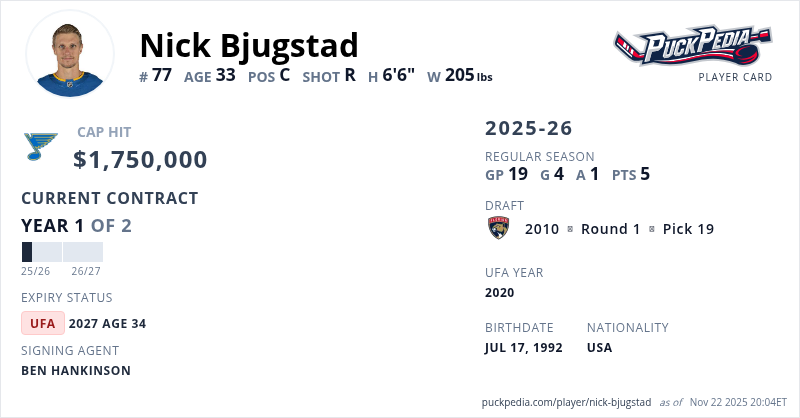 Nick Bjugstad is signed to a 2 year, $3,500,000 contract with a cap hit of $1,750,000 per season, playing for the St. Louis Blues. His contract expires at the end of the 2026-27 season, making Bjugstad an Unrestricted Free Agent.