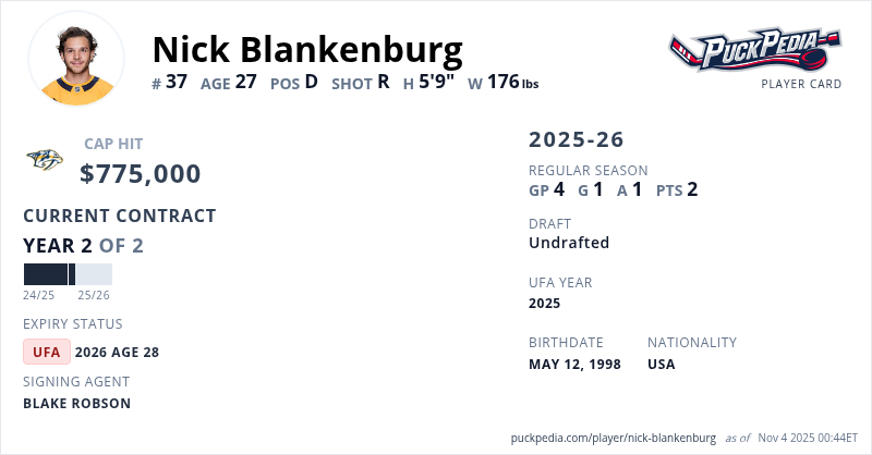 Nick Blankenburg is signed to a 2 year, $1,550,000 contract with a cap hit of $775,000 per season, playing for the Nashville Predators. His contract expires at the end of the 2025-26 season, making Blankenburg an Unrestricted Free Agent.