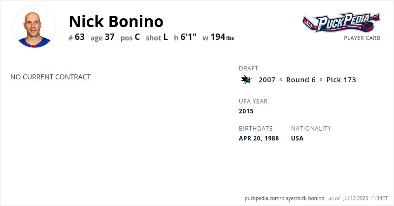 Nick Bonino is an Unrestricted Free Agent. His last contract was 1 year, $800,000 with a cap hit of $800,000 per season. It expired at the end of the 2023-24 season.