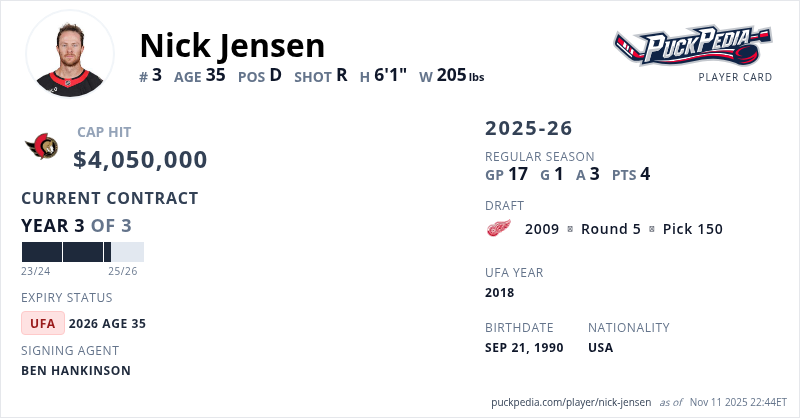 Nick Jensen is signed to a 3 year, $12,150,000 contract with a cap hit of $4,050,000 per season, playing for the Ottawa Senators. His contract expires at the end of the 2025-26 season, making Jensen an Unrestricted Free Agent.