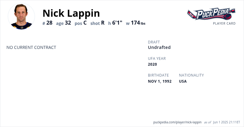Nick Lappin is an Unrestricted Free Agent. His last contract was 1 year, $700,000 with a cap hit of $700,000 per season. It expired at the end of the 2019-20 season.