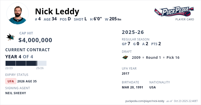 Nick Leddy is signed to a 4 year, $16,000,000 contract with a cap hit of $4,000,000 per season, playing for the San Jose Sharks. His contract expires at the end of the 2025-26 season, making Leddy an Unrestricted Free Agent.