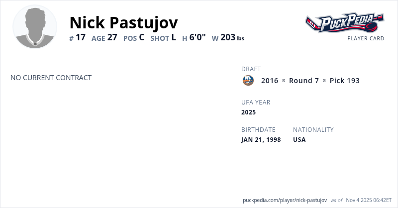 | 2022-23 | 24 | AHL | Coachella Valley Firebirds | 6 | 0 | 0 | 0 | 0 | Playoffs | 6 | 0 | 0 | 0 | 0 | ||||||||||||||||