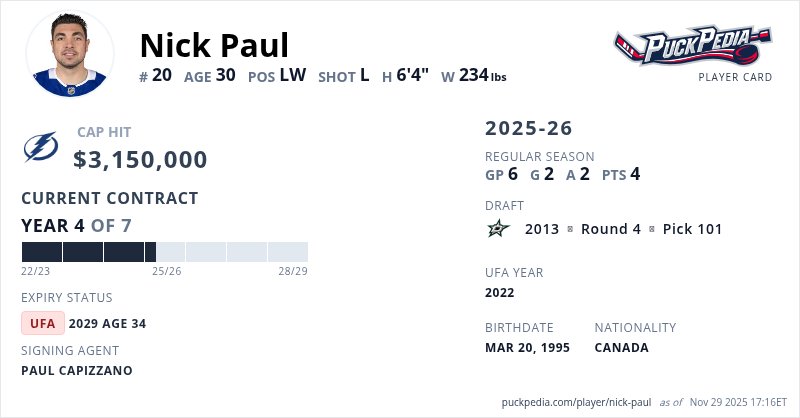 Nick Paul is signed to a 7 year, $22,050,000 contract with a cap hit of $3,150,000 per season, playing for the Tampa Bay Lightning. His contract expires at the end of the 2028-29 season, making Paul an Unrestricted Free Agent.