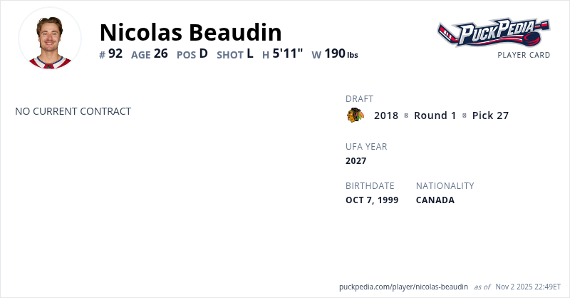 Nicolas Beaudin is an Unrestricted Free Agent. His last contract was 1 year, $775,000 with a cap hit of $775,000 per season. It expired at the end of the 2023-24 season.
